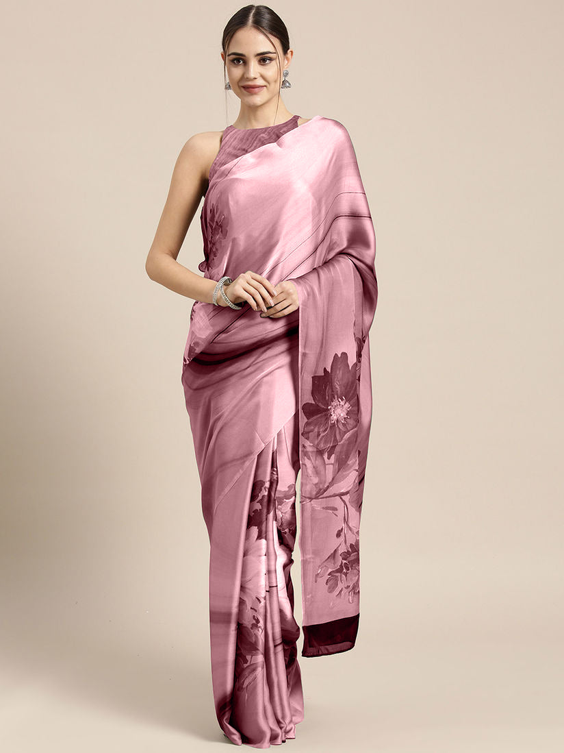 Black Floral Printed Satin Saree With Unstitched Blouse