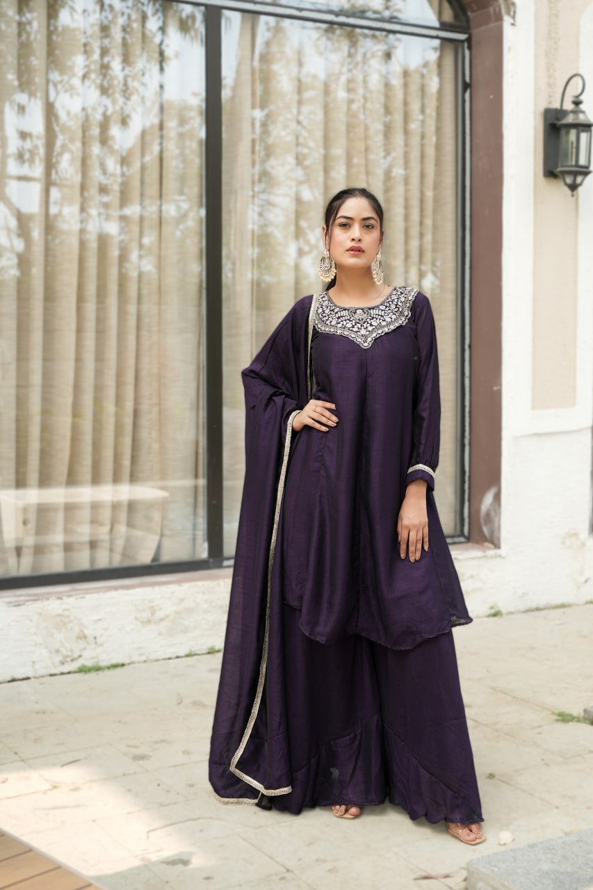 Premium elegant plazo suit set features a beautiful kurta flattering neckline adorned with intricate embroidery...