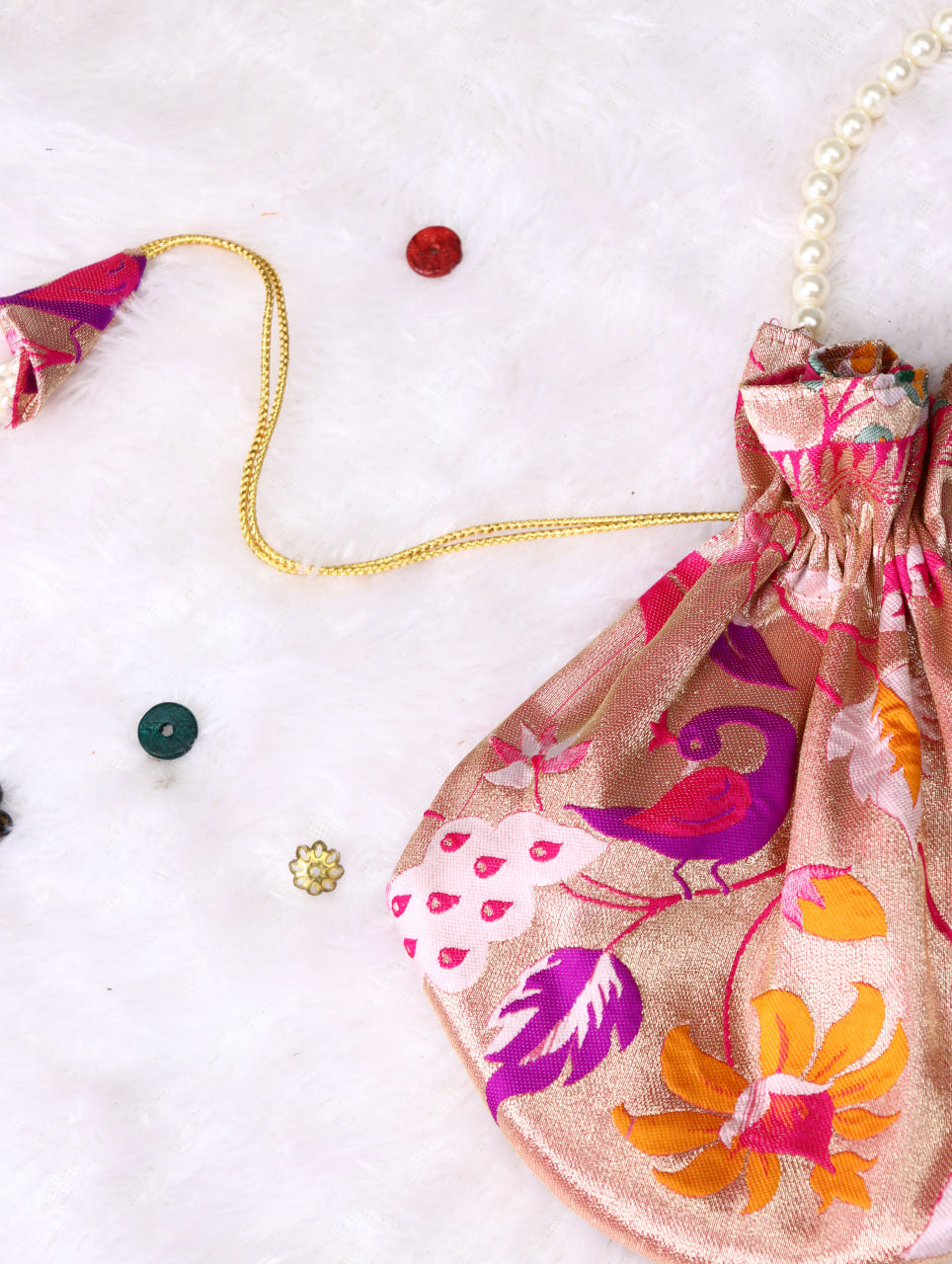 Crafted from rich Paithani silk, this exquisite batwa blends timeless heritage with modern elegance. Adorned with delicate floral motifs and a soft golden sheen, it features a drawstring closure with handcrafted tassels and pearl detailing for a luxurious finish.