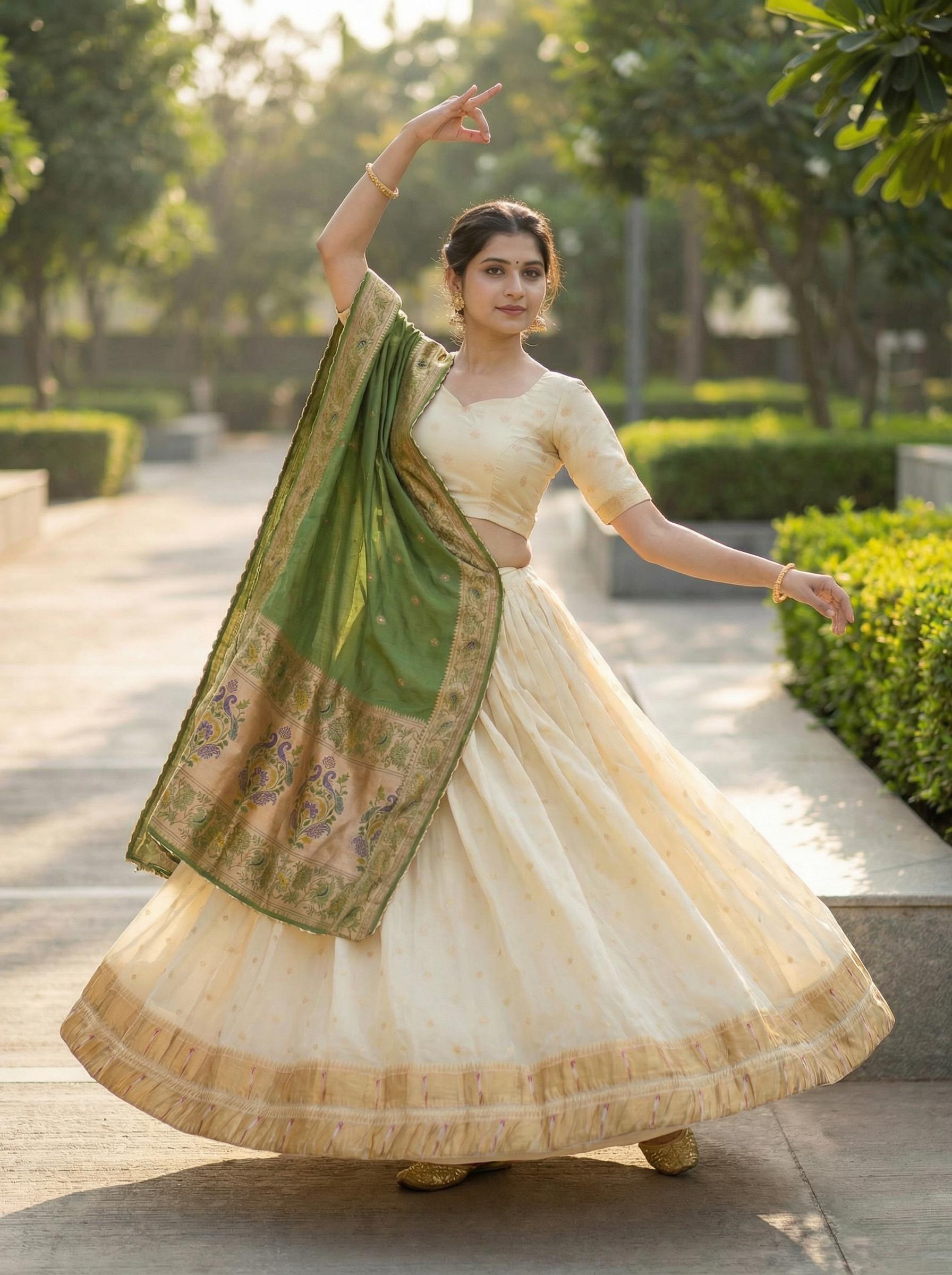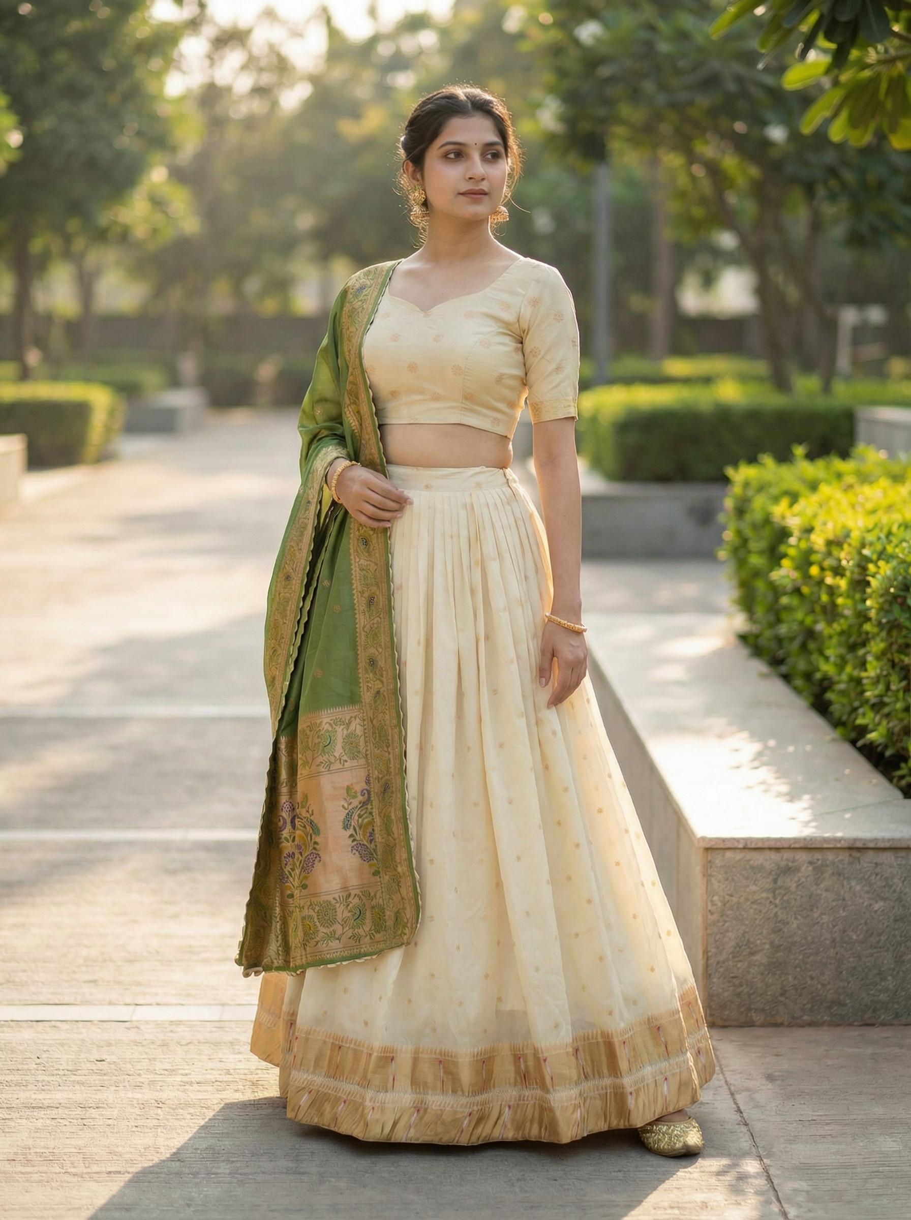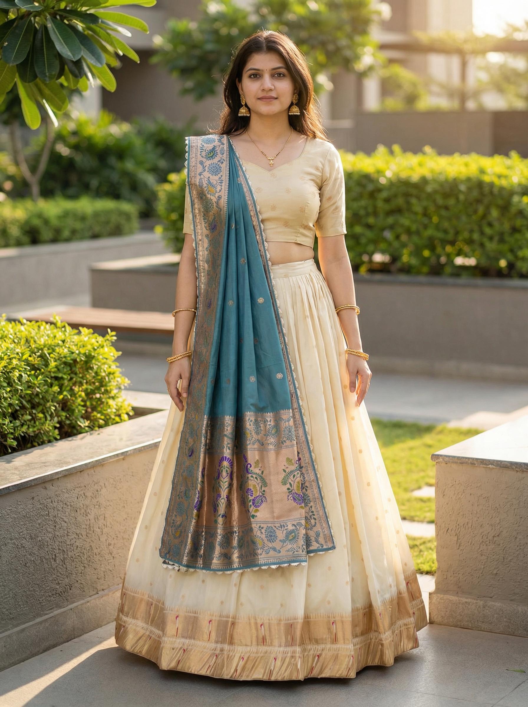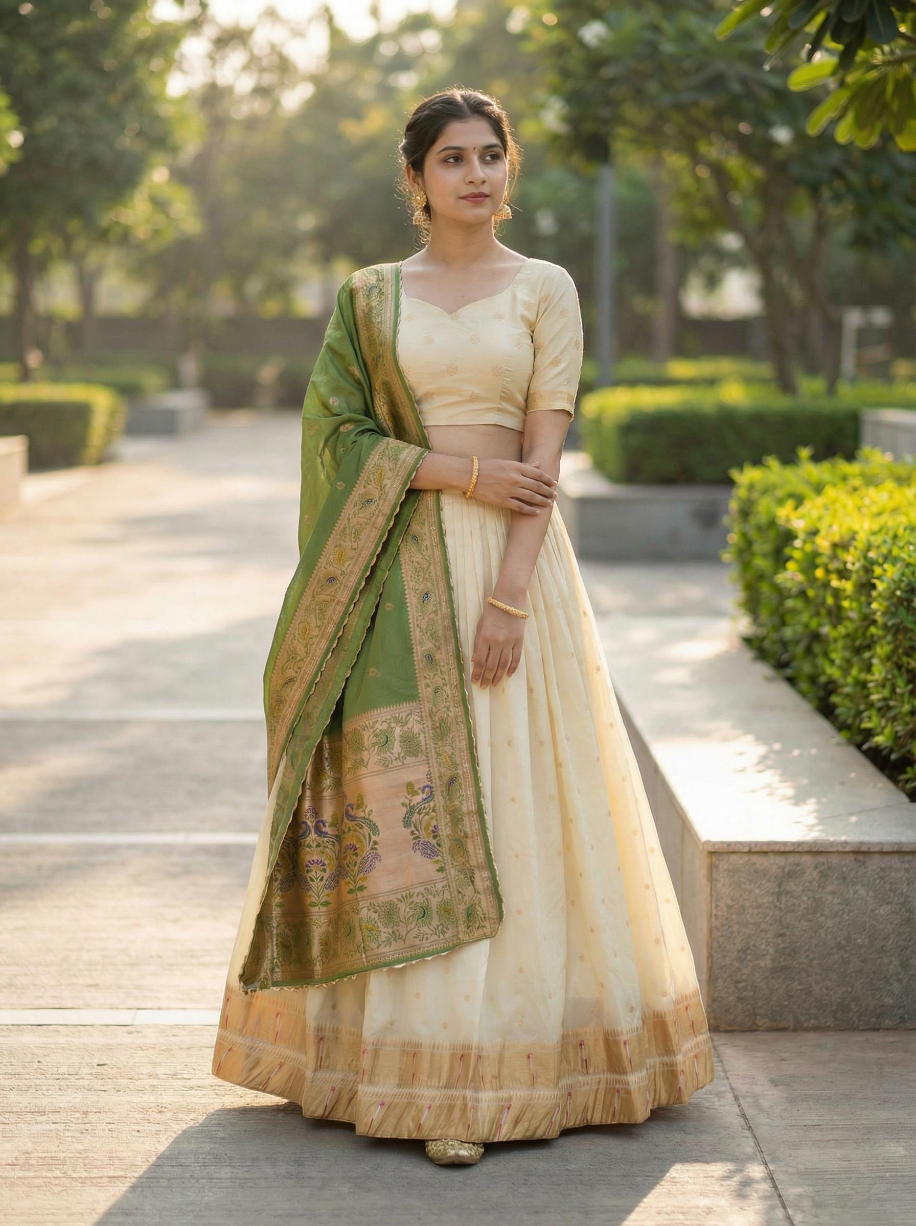 Presenting the richness of Maharashtrian heritage, this exquisite Paithani silk lehenga features vibrant woven motifs and an iconic gold zari border With Iconic Dupatta.