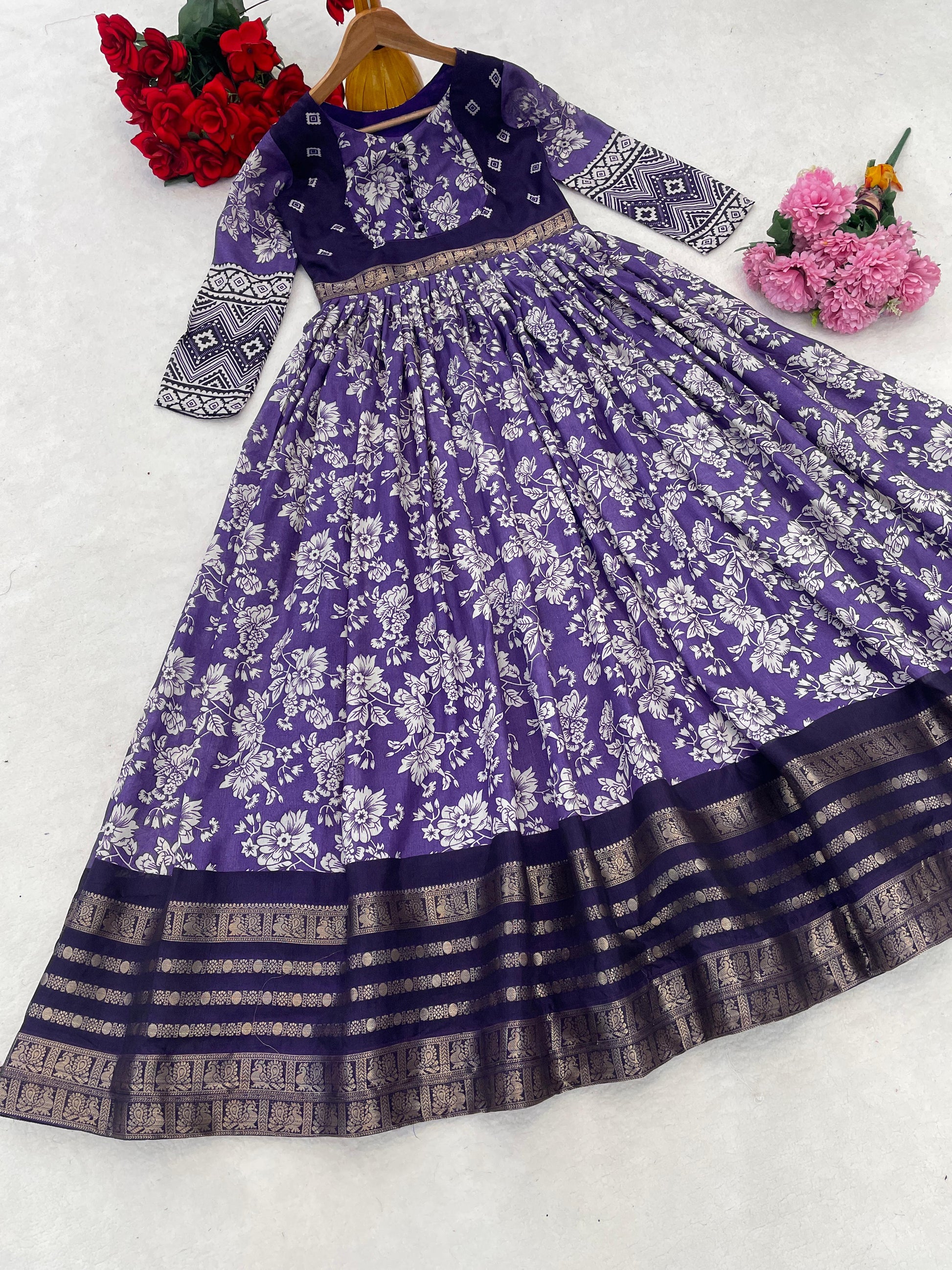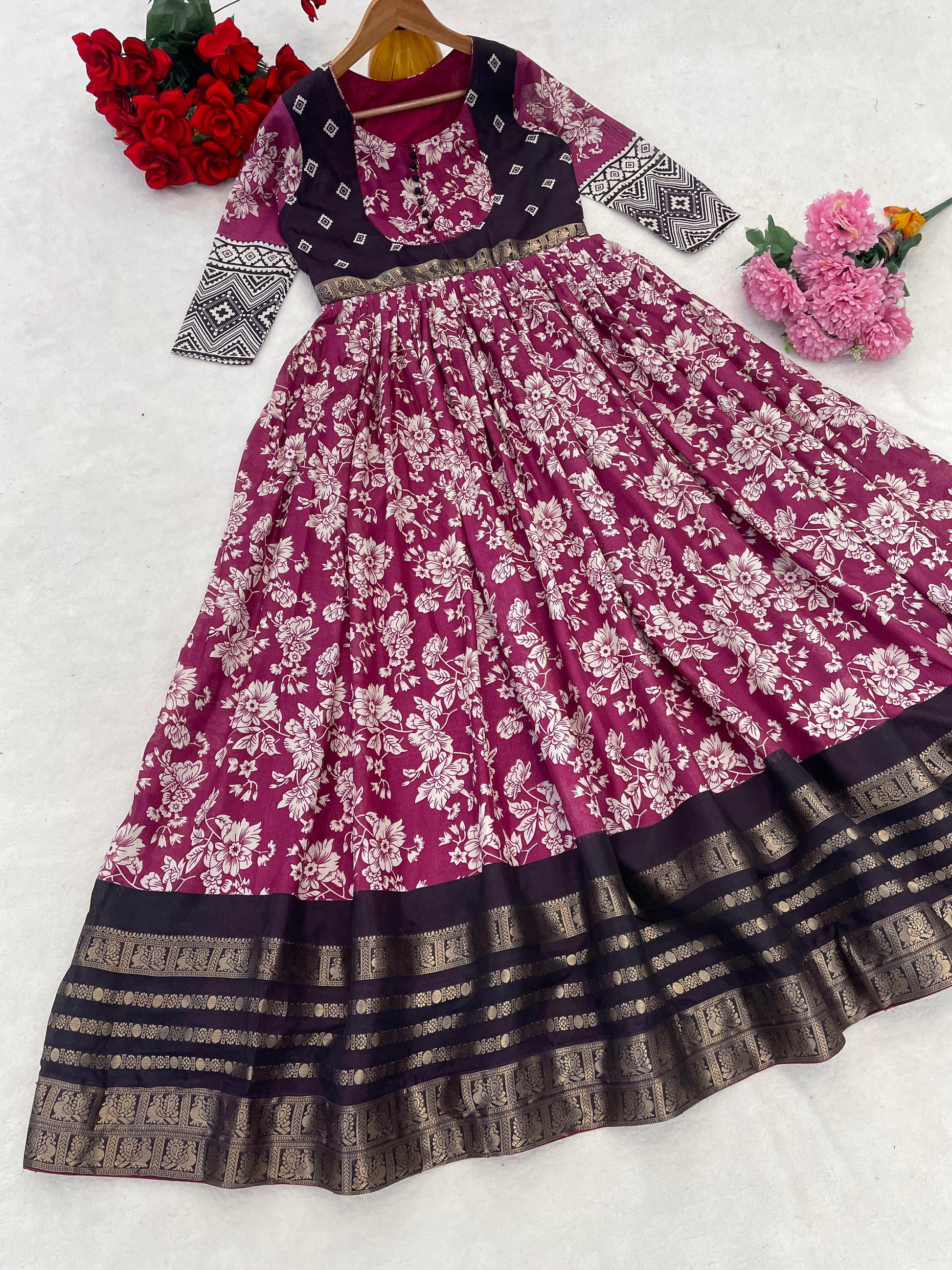 Graceful Kalamkari silk gown paired with a rich jacquard patta for an elegant festive look! Celebrate in style with this beautifully designed Latest silk gown.