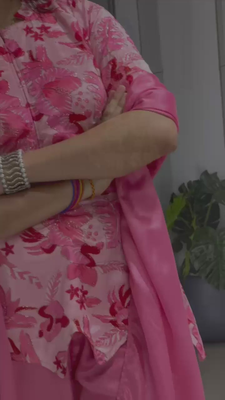 Step into effortless ethnic elegance with this beautifully coordinated Chinon plazo pair, designed for modern festive dressing.Complemented by a matching lightweight dupatta, this ensemble creates a complete and polished look.