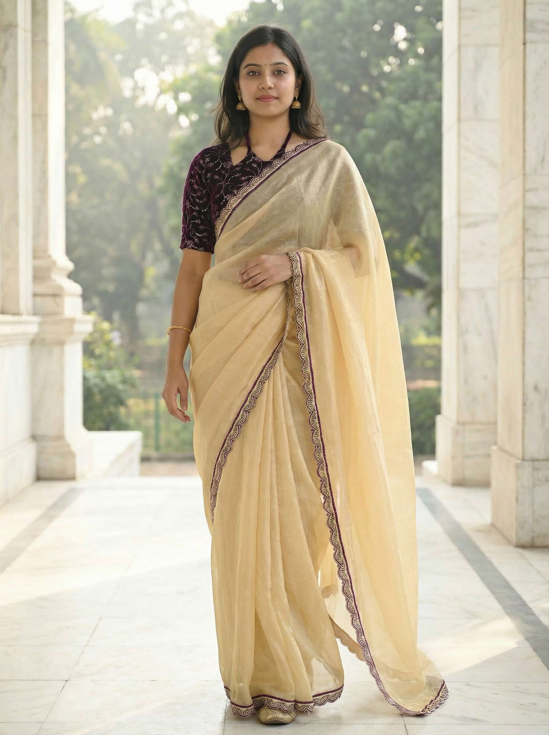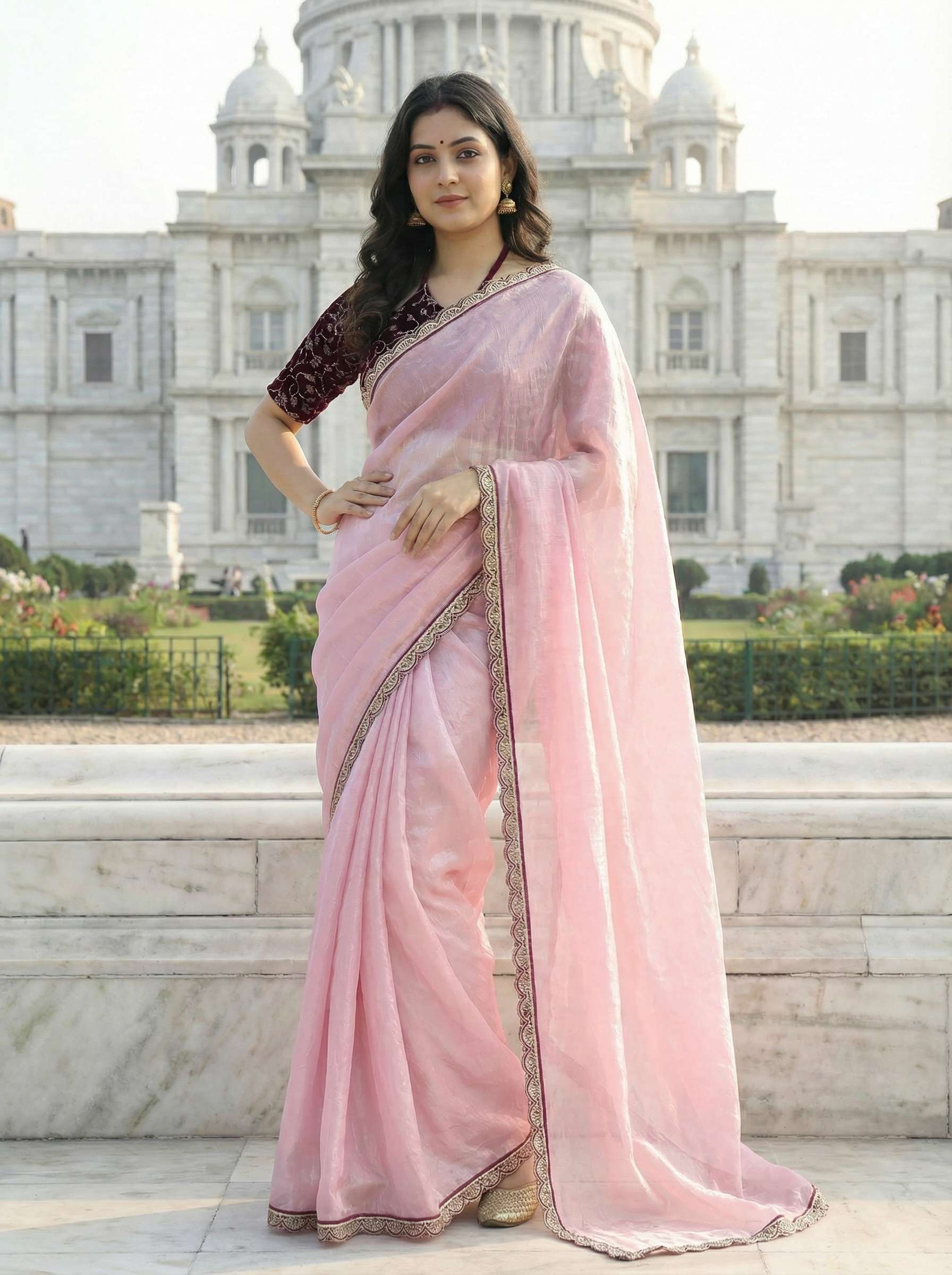 Luxurious Fendy Silk Saree ,The fluid drape of the tissue fabric is grounded by a luxurious contrast Lace Border. It is paired with a plush, deep wine velvet blouse and a matching slim border running along the saree's edge.