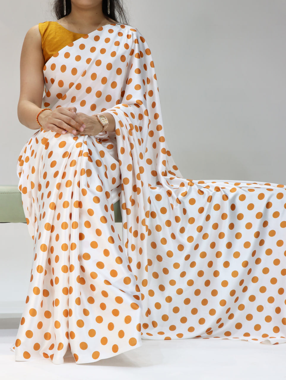 Pure Japan Satin Sarees in Polka Dot prints With Plain Blouse