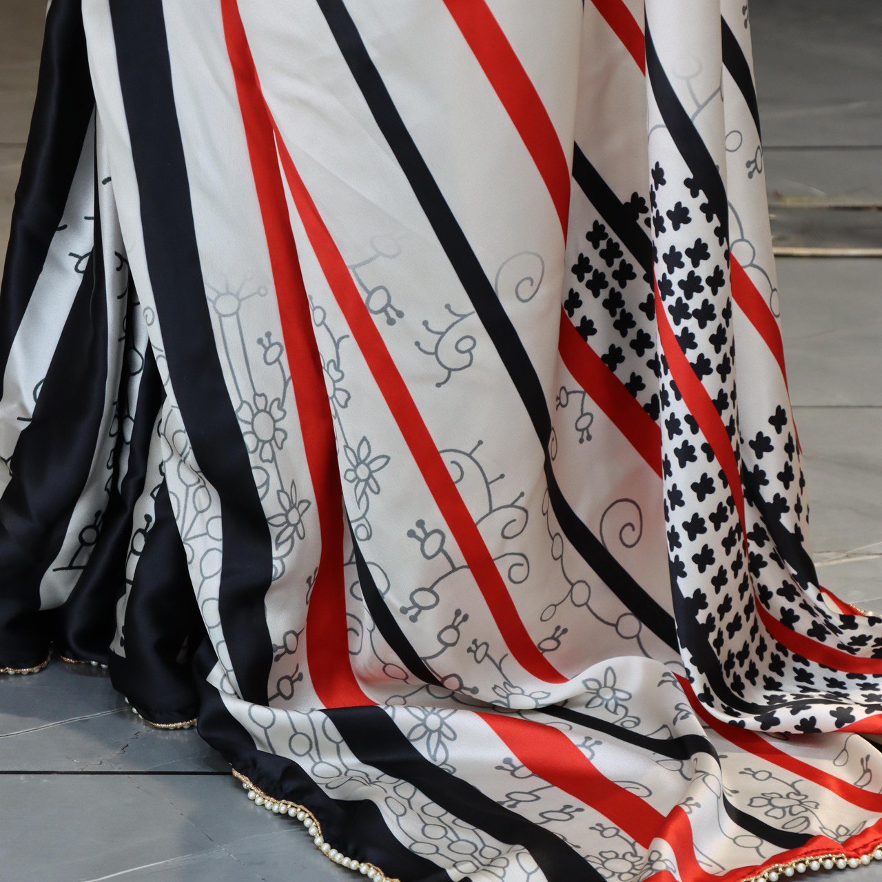 This Japan satin saree features a shimmering finish, enhanced by a delicate pearl lace border for a refined look.